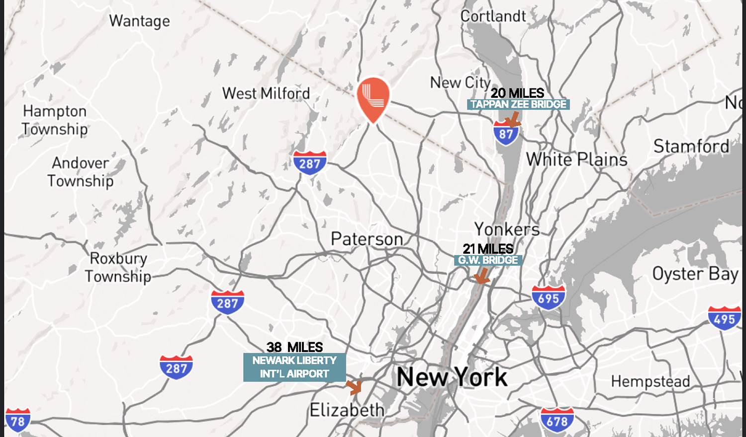 Location Highlights Location Highlights 20 miles to the Tappan Zee Bridge 21 miles to George Washington Bridge 30 miles to Lincoln Tunnel 38 miles to Newark Liberty International Airport 40 miles to Port Newark / Elizabeth